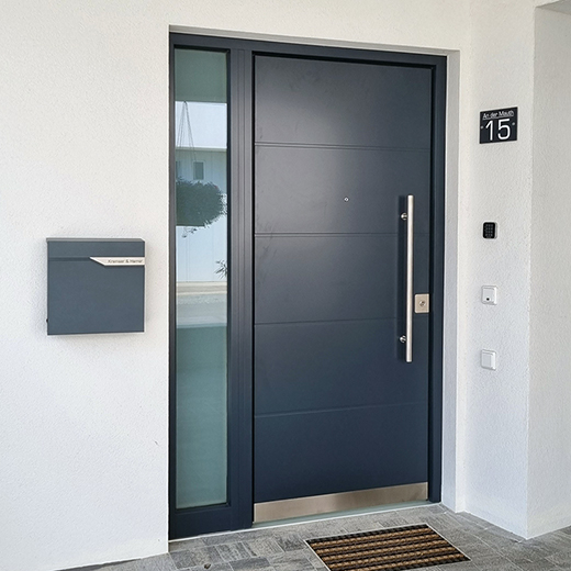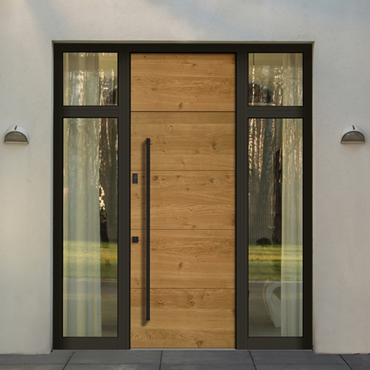 You can choose between wooden or wood-aluminum entrance doors, with or without a side element. You have a wide selection of colors for three types of wood, various glass options with or without a motif, and a wide range of handles and knobs to fully customize the appearance you desire.